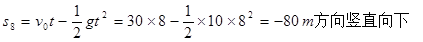本题考查竖直上抛运动规律的应用,竖直上升过程中物体做匀减速直线运动,由速度与时间的关系可求得任意时刻的速度大小和方向,由匀减速直线运动的位移和时间的关系可求得位移大小,路程是路径的长度,由上升的时间为3s可知8s末小球已经做自由落体运动,由竖直上抛运动和自由落体运动可求得路径长度