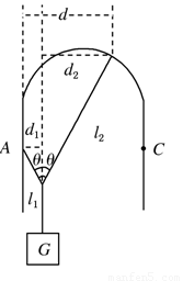 【解析】如图所示,设绳长为l,滑轮左边绳长l1,对应水平距离d1,滑轮右边绳长l2,对应水平距离d2,两点水平距离为d,由滑轮两边绳上受力的对称性可知,两边绳与竖直方向的夹角相等,设为θ,受力分析得:绳上拉力2Tcos θ=G,T=,又因d=d1+d2=l1sin θ+l2sin θ=lsin θ,另一端从B点移动到C点的过程中,l不变,d先增大后不变,故θ先增大后不变,由T=知:拉力T先变大后不变,选C