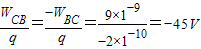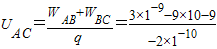 已知电量q=-2×10-10C的点电荷,由A点移到B点,电场力做功为3×10-9J,再由B点移至C点,克服电场力做功为9×10-9J,若定B点为零电势点,求:①UAC;