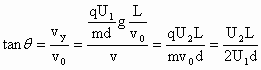 设电子经加速电场后的速度为 v0,偏转极板的长度为L、极间距离为d,离开偏转电场时,沿电场方向的分速度为vy,则偏转角