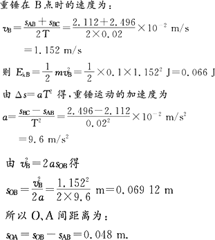如图所示,是“验证机械能守恒”实验中得到的一条合格的纸带,OA之间已用纸盖住,只有A、B、C三点清晰,测得AB=2.112 cm,BC=2.496 cm,打点计时器用的交流电频率为50 Hz,若重锤质量为0.1 kg,重锤下落至B点时的动能等于________J,O、A两点间的距离为________m.