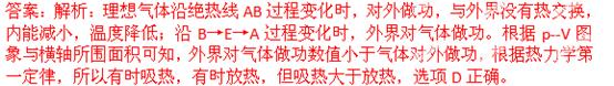 如图所示,,AB为一定量的理想气体的绝热线,当它以图示A→B→E→A过程变化时,下列关于气体吸热、放热的表述正确的是