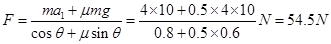 根据受力分析,利用牛顿第二定律:Fcosθ-μ(mg-Fsinθ)=ma1
