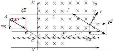 如图所示,空间内存在水平向右的匀强电场,在虚线MN的右侧有垂直纸面向里、磁感应强度为B的匀强磁场,一质量为m、带电荷量为+q的小颗粒自A点由静止开始运动,刚好沿直线运动至光滑绝缘的水平面C点,与水平面碰撞的瞬间小颗粒的竖直分速度立即减为零,而水平分速度不变,小颗粒运动至D处刚好离开水平面,然后沿图示曲线DP轨迹运动,AC与水平面夹角α=30°,重力加速度为g.求:(1)匀强电场的场强E.