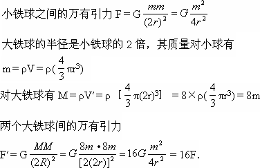 两个大小相同的实心小铁球紧靠在一起时,它们之间的万有引力为F.若两个半径为实心小铁球2倍的实心大铁球紧靠在一起,则它们之间的万有引力为