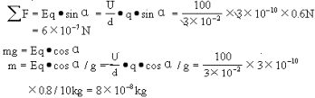 如图,一平行板电容器板长L=4cm,板间距离为d=3cm,倾斜放置,使板面与水平方向夹角a=37°,若两板间所加电压 U=100V,一带电量q= 3×10-10C的负电荷以V0=0.5m/s的速度自 A板左边缘水平进入电场,在电场中沿水平方向运动,并恰好从B板右边缘水平飞出,则带电粒子从电场中飞出时的速度为多少?带电粒子质量为多少?![]()