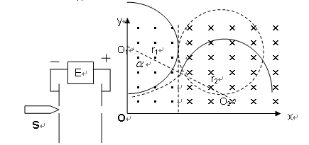 如图所示,s为一电子发射枪,可以连续发射电子束,发射出来的电子初速度可视为0,电子经过平行板A、B之间的加速电场加速后,从o点沿x轴正方向进入xoy平面内,在第一象限内沿x、y轴各放一块平面荧光屏,两屏的交点为o,已知在y>0、0<x<a的范围内有垂直纸面向外的匀强磁场,在y>0、x>a的区域有垂直纸面向里的匀强磁场,大小均为B。已知给平行板AB提供直流电压的电源E可以给平行板AB提供0~U之间的各类数值的电压,现调节电源E的输出电压,从0调到最大值的过程中发现当AB间的电压为