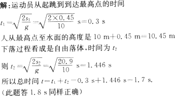 Ò»ÌøË®Ô˶¯Ô±´ÓÀëË®Ãæ10 m¸ßµÄƽ̨ÉÏÏòÉÏÔ¾Æð£¬¾ÙË«±ÛÖ±ÌåÀë¿ªÌ¨Ãæ£¬´ËʱÆäÖØÐÄλÓÚ´ÓÊÖµ½½ÅÈ«³¤µÄÖе㣬ԾÆðºóÖØÐÄÉý¸ß0.45 m´ïµ½×î¸ßµã£¬ÂäˮʱÉíÌåÊúÖ±£¬ÊÖÏÈÈëË®(Ôڴ˹ý³ÌÖÐÔ˶¯Ô±Ë®Æ½·½ÏòµÄÔ˶¯ºöÂÔ²»¼Æ)£¬´ÓÀë¿ªÌøÌ¨µ½ÊÖ´¥Ë®Ã棬Ëû¿ÉÓÃÓÚÍê³É¿ÕÖж¯×÷µÄʱ¼äÊÇ________s£®(¼ÆËãʱ£¬¿ÉÒÔ°ÑÔ˶¯Ô±¿´×÷È«²¿ÖÊÁ¿¼¯ÖÐÔÚÖØÐĵÄÒ»¸öÖʵ㣬gȡΪ10 m/s2£¬½á¹û±£Áô¶þλÊý×Ö)