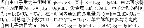 如图所示,有一金属块放在垂直于表面C的匀强磁场中,磁感应强度B,金属块的厚度为d,高为h,当有稳恒电流I平行平面C的方向通过时,由于磁场力的作用,金属块中单位体积内参与导电的自由电子数目为(上下两面M、N上的电压分别为UM、UN)