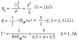 P总=Iε=1.8×9W=16.2W P出=I2(R+R2)=1.82×4.5=14.58W P线=I2R=1.82×0.5=1.62W VL=ε-I(R+r)=9-1.8(0.5+0.5)=7.2(V)