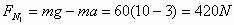 解:人随电梯一起运动加速度相等 0-2 s a1=3 m/s2 2-6 s a2=0 6-8 s a3=-3 m/s2 运动中人受力 0-2 s 6-8 s ∴电梯向下运动减速时压力最大为780 N,向下加速时压力最小为420 N.