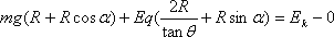 解:(1)令小物块动能最大的位置为D点,分析得: 当电场力与重力的合力反向延长线过半圆轨道圆心时, 小物块动能最大,如图有 因为mgcos 所以小物块与倾斜轨道间无摩擦 A 代入数据解得: (2)小物块恰好通过最高处C点,有 从释放点到C点由动能定理 ①②式联立解得: (3)小物块离开C点后做平抛运动 整理有: 解得: |