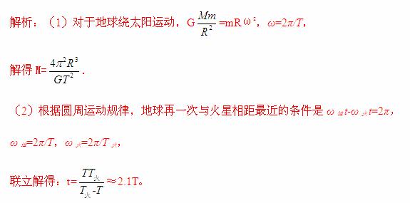 (2)已知火星绕太阳做圆周运动的周期为1.9T,求地球与火星相邻两次距离最近时的时间间隔t。