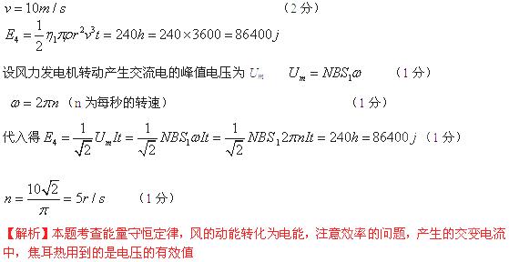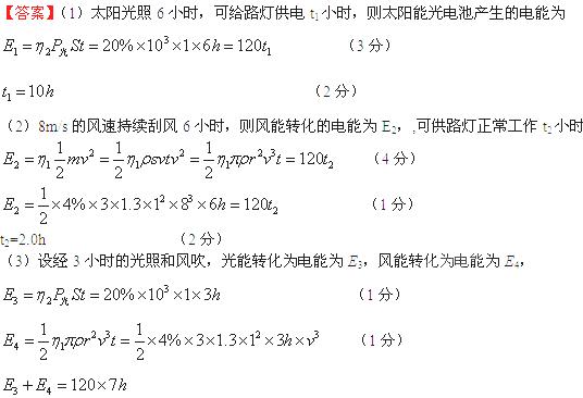 (3)如果在一有风的晴天,经3小时的光照和风吹,路灯可正常工作7小时,则风速为多大?若通过交流电表测得风力发电机线圈的电流强度为1A,则此时风叶的转速为多少?