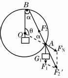 如图所示,光滑小圆环A吊着一个重为G1的砝码套在另一个竖直放置的大圆环上,今有一细绳拴在小圆环A上,另一端跨过固定在大圆环最高点B处的一个小滑轮后吊着一个重为G2的砝码,如果不计小环、滑轮、绳子的重力大小.绳子又不可伸长,求平衡时弦AB所对的圆心角θ.
