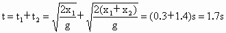一跳水运动员从离水面10m高的平台上向上跃起,举双臂直体离开台面,此时其重心位于手到脚全长的中点.跃起后升高0.45m达到最高点.落水时身体竖直,手先入水(在此过程中运动员水平方向的运动忽略不计).从离开跳台到手触水面,他可用于完成空中动作的时间是________s.计算时可以把运动员看成一个全部质量集中在重心的一个质点,g取