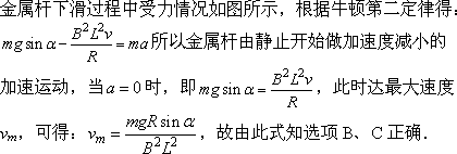 如图所示,有两根和水平方向成α角的光滑平行的金属轨道,上端接有可变电阻R,下端足够长,空间有垂直于轨道平面的匀强磁场,磁感强度为B,一根质量为m的金属杆从轨道上由静止滑下.经过足够长的时间后,金属杆的速度会趋近于一个最大速度vm,则