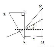 如图所示,有一截面是直角三角形的棱镜ABC,∠A=30º.它对红光的折射率为n1.对紫光的折射率为n2.在距AC边d处有一与AC平行的光屏。现有由以上两种色光组成的很细的光束垂直AB边射入棱镜。 若两种光都能从AC面射出,求在光屏MN上两光点间的距离。