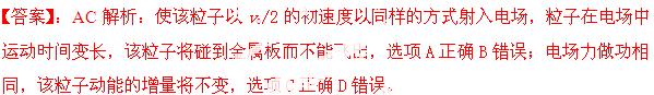 £¨2013ÉòÑô¶þÖвâÊÔ£©Æ½ÐаåµçÈÝÆ÷Á½°å¼äµÄµçѹΪU,°å¼ä¾àÀëΪd,Ò»¸öÖÊÁ¿Îªm,µçºÉÁ¿ÎªqµÄ´øµçÁ£×ӴӸõçÈÝÆ÷µÄÕýÖÐÑëÑØÓëÔÈÇ¿µç³¡µÄµç³¡Ïß´¹Ö±µÄ·½ÏòÉäÈë,²»¼ÆÖØÁ¦。µ±Á£×ÓµÄÈëÉä³õËÙ¶ÈΪv0ʱ,ËüÇ¡ºÃÄÜ´©¹ýµç³¡¶ø²»Åöµ½½ðÊô°å。ÏÖÔÚʹ¸ÃÁ£×ÓÒÔv0/2µÄ³õËÙ¶ÈÒÔͬÑùµÄ·½Ê½ÉäÈëµç³¡£¬ÏÂÁÐÇé¿öÕýÈ·µÄÊÇ£¨ £©