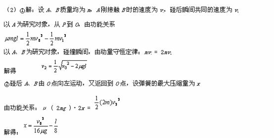 如图,轻弹簧的一端固定,另一端与滑块B相连,B静止在水平导轨上的O点,此时弹簧处于原长.另一质量与B相同的滑块A从导轨上的P点以初速度v0向B滑行,当A滑过距离l时,与B相碰.碰撞时间极短,碰后A、B粘在一起运动.设滑块A和B均可视为质点,与导轨的动摩擦因数均为μ.重力加速度为g.求: