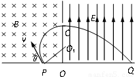ÈçͼËùʾµÄÇøÓòÖУ¬×ó±ßΪ´¹Ö±Ö½ÃæÏòÀïµÄÔÈÇ¿´Å³¡£¬´Å¸ÐӦǿ¶ÈΪ B£¬ÓÒ±ßÊÇÒ»¸öµç³¡Ç¿¶È´óСδ֪µÄÔÈÇ¿µç³¡£¬Æä·½ÏòƽÐÐÓÚOCÇÒ´¹Ö±Óڴų¡·½Ïò£®Ò»¸öÖÊÁ¿Îªm¡¢µçºÉÁ¿Îª-q µÄ´øµçÁ£×Ó´ÓP¿×ÒÔ³õËÙ¶È vÑØ´¹Ö±Óڴų¡·½Ïò½øÈËÔÈÇ¿´Å³¡ÖУ¬³õËÙ¶È·½ÏòÓë±ß½çÏߵļнǦÈ=60£¬Á£×ÓÇ¡ºÃ´ÓC¿×´¹Ö±ÓÚOCÉäÈëÔÈÇ¿µç³¡£¬×îºó´òÔÚQµã£¬ÒÑÖªOQ=2OC£¬²»¼ÆÁ£×ÓµÄÖØÁ¦£¬Ç󣺣¨1£©µç³¡Ç¿¶ÈEµÄ´óС£»