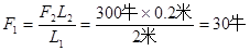 (6分)杠杆的动力臂L1为2米,阻力臂L2为0.2米,若阻力F2为300牛,求杠杆平衡时的动力F1 ?