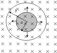 一个实心圆柱导体和一个中空圆柱形导体共轴放置,其间为真空.实心柱体半径为a,中空柱体内半径为b,如图所示,其间有磁感应强度为B的匀强磁场,一个电子以径向速度从内柱体表面射出,试问电子的速度满足什么条件才能和中空柱体相碰,设电子质量为m,电量为e.
