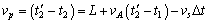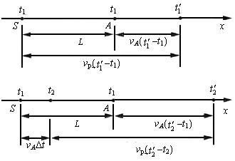 | (1)设t1、t2为声源S发出两个信号的时刻, 设声源发出第一个信号时,S、A两点间的距离为L,两个声信号从声源传播到观察者的过程中,它们运动的距离关系如图所示。可得