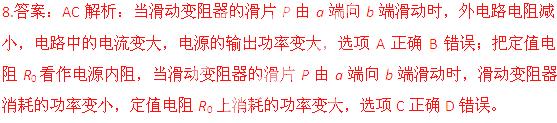 (2012年海南琼海一模)如图所示,电动势为E、内阻为r的电池与定值电阻R0、滑动变阻器R串联,已知R0=r,滑动变阻器的最大阻值是2r。当滑动变阻器的滑片P由a端向b端滑动时,下列说法中正确的是( )