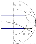 点评:本题主要考查了带电粒子分别在电场和磁场中的运动情况,当两极间加上电压时,粒子做类平抛运动,根据类平抛运动规律求解问题.粒子在匀强磁场中的运动,要掌握住半径公式,画出粒子的运动轨迹后,几何关系就比较明显了.