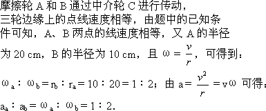 如图所示,摩擦轮A和B固定在一起通过中介轮C进行传动,A为主动轮,A的半径为20cm,B的半径为10cm,A、B两轮边缘上的向心加速度之比( )![]()