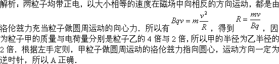 粒子甲的质量与电荷量分别是粒子乙的4倍与2倍,两粒子均带正电.让它们在匀强磁场中同一点以大小相等、方向相反的速度开始运动.己知磁场方向垂直纸面向里.以下四个图中,能正确表示两粒子运动轨迹的是