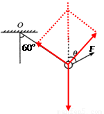 如图所示,一小球用轻绳悬于O点,用力F拉住小球,使悬线保持偏离竖直方向60°角,且小球始终处于平衡状态。为了使F有最小值,F与竖直方向的夹角θ应该是