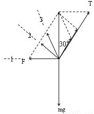 解:小球受到三个力作用:重力mg、电场力F和细线的拉力T,根据平衡条件得知:F和T的合力与重力mg大小相等、方向相反,作出电场力在三种不同方向下合成图如图,可以看出,当电场力F与细线的拉力T垂直时,电场力最小,由图求出电场力的最小值为