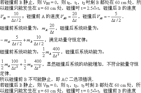 D.碰后B静止,碰撞发生在60 cm处,t=2.5Δt.