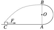 如图所示,半径R=0.4 m的光滑半圆轨道与粗糙的水平面相切于A点,质量为m=1 kg的小物体(可视为质点)在水平拉力F的作用下,从静止开始由C点运动到A点,物体从A点进入半圆轨道的同时撤去外力F,物体沿半圆轨道通过最高点B后做平抛运动,正好落在C点,已知xAC=2 m,F=15 N,g取10 m/s2,试求: