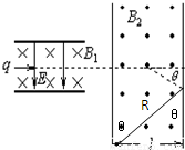 如图所示,带电量为q的粒子(不计重力),匀速直线通过速度选择器(电场强度为E,磁感应强度为B1),又通过宽度为l,磁感应强度为B2的匀强磁场,粒子离开磁场时速度的方向跟入射方向间的偏角为θ.求:(1)粒子在速度选择器中匀速运动的速度v为多少?