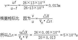 一辆汽车以20m/s的速度沿高速公路由东向西行驶. 一摄影师站在公路南侧距汽车行驶路线约26m处准备为汽车拍照, 计划在汽车离相机最近时打开快门曝光, 要求汽车在底片上的像移动的距离不超过△X=0.05mm, 则曝光时间△t不应超过_____×10-3s, 已知照相机镜头的焦距f=13mm. (取一位有效数字, 指数表示)