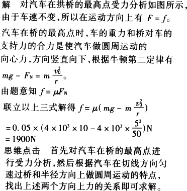 一辆质量为4 t的汽车驶过一半径为50 m的凸形桥面时,始终保持5 m/s的速率,汽车所受的阻力为车对桥面压力的0.05倍,通过桥的最高点时汽车的牵引力是多大?