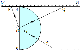 ,直径AB与屏幕垂直并接触于A点.激光a以入射角i=30°射向半圆玻璃砖的圆心O,结果在水平屏幕MN上出现两个光斑.求两个光斑之间的距离L.