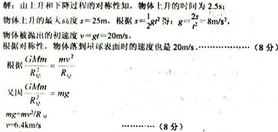一物体从某一行星(该星球的半径为地球半径的4/5)表面竖直向上抛出(不计空气阻力)t=0时抛出,得到如图24所示的s-t图象,求物体落到行星表面时的速度和该行星的第一宇宙速度。(可能用到的数据:R地球=6400m,地球的第一宇宙速度取8km/s)