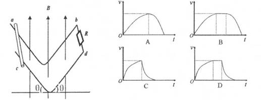 ÈçͼËùʾ£¬Óɵç×è²»¼ÆµÄ½ðÊô¸Ëab¡¢cd¹¹³ÉµÄ¡°V¡±×ÖÐζԳƹ⻬¹ìµÀ£¬ÔÚ¹ìµÀµ×²¿Ò»Ð¡¶Î¹â»¬Ô²»¡Á¬½Ó£¨Æä³¤¶È¿ÉºöÂÔ²»¼Æ£©£¬bd¼ä½ÓÓÐÒ»¶¨Öµµç×èR£¬Ò»¸ùµç×è²»¼Æ µÄµ¼Ìå°ôÔÚt =0ʱ¿Ì´Óac¶ËÓɾ²Ö¹¿ªÊ¼Ï»¬£¬Õû¸ö×°Öô¦ÔÚ·½ÏòÊúÖ±ÏòÉϵÄÔÈÇ¿´Å³¡ ÖС£ÔÚµ¼Ìå°ôµÚÒ»´Îµ½´ï¹ìµÀÓÒ²à×î¸ßµãµÄ¹ý³ÌÖУ¬µ¼Ìå°ôʼÖÕ´¦ÓÚˮƽ״̬£¬ÏÖÓÃv ±íʾµ¼Ìå°ôËٶȵĴóС£¬ÔòÔÚÏÂÁÐËĸöv tͼÏñÖУ¬¿ÉÄÜÕýÈ·µÄÊÇ ![]()