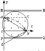 如图所示,MN、PQ是两块水平放置且长度相同的平行金属板,板间存在磁感应强度为B=1.25T的圆形匀强磁场,圆与两金属板相切.以圆上一点O为原点建立xoy直角坐标系,两板左端M、P在y轴上,圆与y轴的交点为α,Oα=0.2m.质量为m=5×10-8kg、带电量为q=10-5C的粒子从α点垂直y轴射入磁场,MN、PQ两板间的电压为0时,粒子的射入速度为v1,从b点射出磁场,速度方向与x轴成60°角;MN、PQ两板间的电压为U时,粒子以50m/s的速度射入磁场,在磁场中速度方向保持不变,并且粒子恰能从上板边缘离开电场,此后粒子做匀速直线运动.已知粒子的重力大小不计.求:(1)圆形磁场区的半径大小为多少?