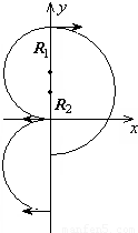 如右图是粒子在一个周期的运动,则粒子在一个周期内经过y负半轴的点在y负半轴下移2(R2-R1),在第n次经过y负半轴时应下移2R1,