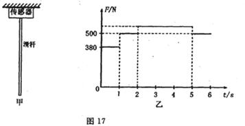 ÈçͼËùʾ£¬¼×Ϊ²Ù×÷ÉÏÒ»ÖÊÁ¿²»¼ÆµÄÊúÖ±»¬¸Ë£¬»¬¸ËÉ϶˹̶¨£¬Ï¶ËÐü¿Õ£¬ÎªÁËÑо¿Ñ§ÉúÑØ¸ËÏ»¬µÄÇé¿ö£¬Ôڸ˵Ķ¥²¿×°ÓÐÒ»ÀÁ¦´«¸ÐÆ÷£¬¿ÉÏÔʾ¸ËµÄ¶¥¶ËËùÊÜÀÁ¦µÄ´óС£¬ÏÖÓÐһѧÉúÊÖÎÕ»¬¸Ë£¬´Ó¸ËµÄÉ϶ËÓɾ²Ö¹¿ªÊ¼Ï»¬£¬Ï»¬5sºóÕâ¸öѧÉúµÄÏ»¬ËÙ¶ÈΪÁ㣬²¢ÓÃÊÖ½ôÎÕס»¬¸Ë±£³Ö¾²Ö¹²»¶¯£¬ÒÔÕâ¸öѧÉú¿ªÊ¼Ï»¬Ê±¿ÌΪ¼ÆÊ±Æðµã£¬´«¸ÐÆ÷ÏÔʾµÄÁ¦ËæÊ±¼ä±ä»¯µÄÇé¿öÈçͼÒÒËùʾ¡£g=10m/s2£¬Çó£º