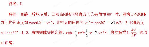 (2013福建省二校联考)有一竖直放置的“T”形架,表面光滑,滑块A、B分别套在水平杆与竖直杆上,A、B用一不可伸长的轻细绳相连,A、B质量相等,且可看做质点,如图4所示,开始时细绳水平伸直,A、B静止.由静止释放B后,已知当细绳与竖直方向的夹角为60°时,滑块B沿着竖直杆下滑的速度为v,则连接A、B的绳长为 ( )