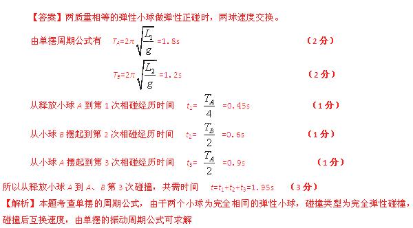 ÈçͼËùʾ£¬Á½¸öÖÊÁ¿ÏàµÈµÄµ¯ÐÔСÇòAºÍB·Ö±ð¹ÒÔÚL1=0.81m£¬L2=0.36mµÄϸÏßÉÏ£¬Á½ÇòÖØÐĵȸßÇÒ»¥Ïà½Ó´¥£¬ÏÖ½«AÇòÀÀëÆ½ºâλÖÃÓëÊúÖ±·½Ïò¼Ð½ÇСÓÚ5¡ãºóÓɾ²Ö¹¿ªÊ¼ÊÍ·Å£¬ÒÑÖªµ±AÓëBÏàÅöʱ·¢ÉúËٶȽ»»»£¬¼´ÅöºóAÇòËÙ¶ÈΪÁ㣬BÇòËٶȵÈÓÚAÇòÅöǰµÄËÙ¶È£»µ±BÓëAÏàÅöʱ×ñÑÏàͬµÄ¹æÂÉ£¬ÇÒÅöײʱ¼ä¼«¶ÌºöÂÔ²»¼Æ¡£Çó´ÓÊÍ·ÅСÇòA¿ªÊ¼µ½Á½Çò·¢ÉúµÚ3´ÎÅöײµÄʱ¼ät¡££¨ÒÑÖª¦Ð2¡Ög£©