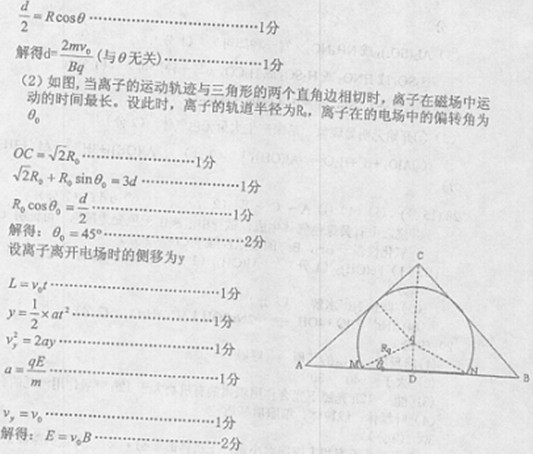 如图所示,等腰直角三角形ABC区域内有磁感应强度大小为B,方向垂直纸面匈里的匀强磁场,AB边水平。磁场下方有一方向水平向右的匀强电场。现有一质量为m电量为q的负离子(重力不计),以速度v0沿图中虚线垂直电场且正对三角形ABC的顶点C射入,穿过电场区域后,负离子从AB边进入磁场,又从AB边射出。已知AB=