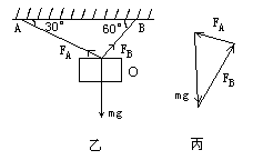 【解答】当绳下端所挂物体的质量不断增大时,OA、OB两绳所受的拉力同时增大,为了判断哪根绳先断,可选物体为研究对象,其受力情况如图乙所示,假设两根绳都不断,则由物体平衡可画出由三个力组成的矢量三角形(如图丙所示),由图可得FA=mgsin