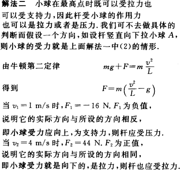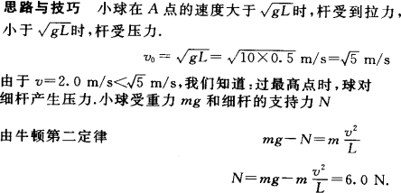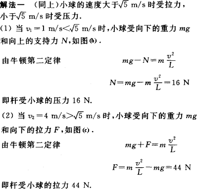 评析:长L=0.5 m,质量可以忽略的杆,其下端固定于O点,上端连接着一个质量m=2 kg的小球A,A绕O点做圆周运动(同如图(a)),在A通过最高点,试讨论在下列两种情况下杆的受力: (1)当A的速率v1=1 m/s时. (2)当A的速率v2=4 m/s时.